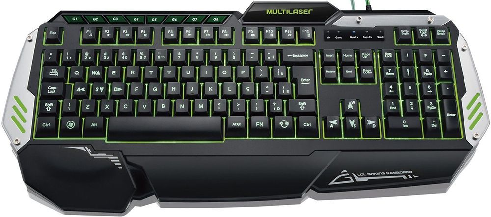 . Recursos anti-ghosting (teclas Q, W, E, A, S, D, Z, X, C, V, barra de espaço, CTRL, Shift, Control, Alt, seta para cima, seta para baixo, seta para esquerda, seta para direita)